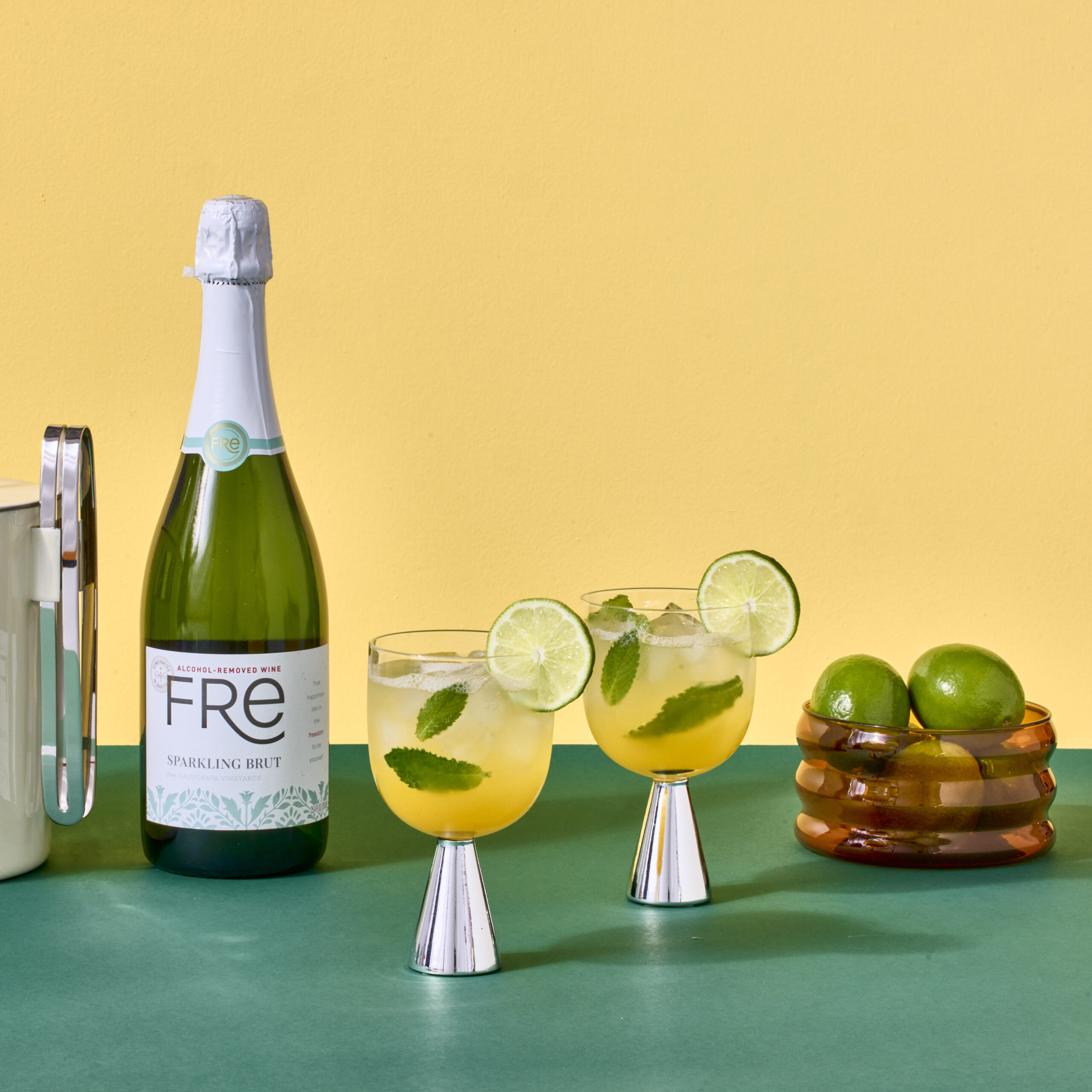 - Fill the glass with ice. Top with FRE Sparkling Brut and sparkling water and stir gently.